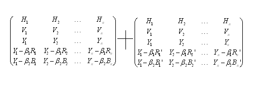 現(xiàn)行的彩色電視系統(tǒng)中,由行向量H,幀向量V,亮度向量Y組成的,表達(dá)彩色信息的是由紅向量R,綠向量G,蘭向量B的三維線性空間。也可用以下的矩陣來表示:
