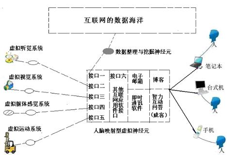 在相關(guān)論文中,我們也繪制了更為詳細(xì)的互聯(lián)網(wǎng)映射型虛擬神經(jīng)元,它是以目前互聯(lián)網(wǎng)個(gè)人空間應(yīng)用為基礎(chǔ),擴(kuò)充并預(yù)言了成熟后的互聯(lián)網(wǎng)神經(jīng)元結(jié)構(gòu)。