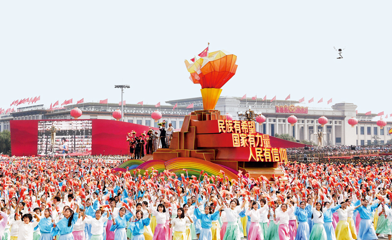 2019年10月1日,慶祝中華人民共和國(guó)成立70周年大會(huì)在北京天安門廣場(chǎng)隆重舉行。這是群眾游行中的“凝心鑄魂”方陣。 新華社記者 李欣/攝