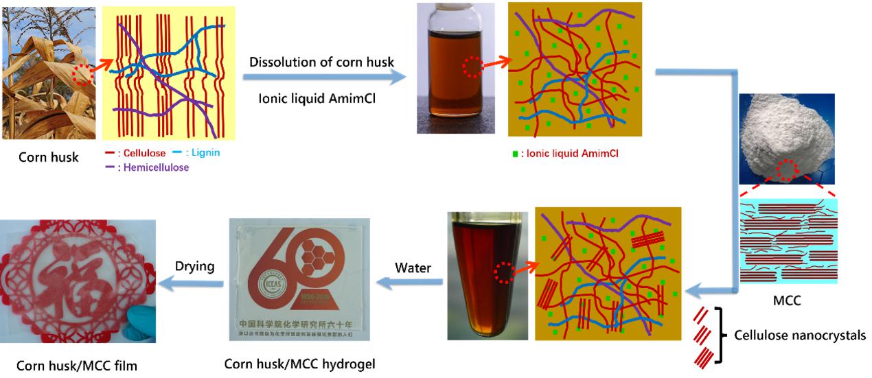 我們做出的兩類離子液體溶劑,可以在一個很溫和的條件下(一般不超過100℃)將纖維素溶解。過去一二十年有很多人做纖維素的離子液體體系,目前公認最好的三種離子液體中有兩種是我們發(fā)明的,其中AmimCl可以溶解木材,被稱為溶解能力最強的溶劑。后來我們提出了它的溶解機理,我們認為離子液體陰陽離子結構和纖維素羥基的分別作用把里面原來氫鍵打開,像剪漁網(wǎng)似的,使它變成線性的分子才能溶解。