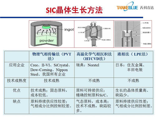 碳化硅襯底的生長方法有三種:一是物理氣相傳輸法,該技術(shù)相對成熟,性價比高;二是高溫化學氣相沉積法,優(yōu)點是原料可持續(xù)供應,可精確控制原料中的碳硅比;三是液相法,尚處于研究階段。