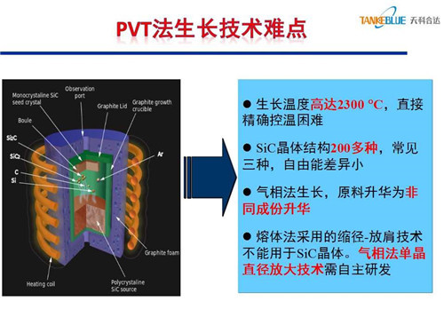 PVT法生長碳化硅存在以下技術(shù)難點,一是晶體生長溫度高達2300℃,直接精確控溫困難;二是很難獲得單一的碳化硅晶體結(jié)構(gòu);三是生長時原料易升華為非同成份其他物質(zhì);四是熔體法采用的縮徑-放肩技術(shù)不適用于氣相法碳化硅晶體生長,氣相法單晶直徑放大技術(shù)需自主研發(fā)。