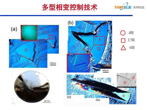 碳化硅晶體生長時如果臺階過寬,晶型沿 [0001] 方向的排列信息反應不出來,會在臺階上自發(fā)成核,發(fā)生晶型轉(zhuǎn)變。研究發(fā)現(xiàn),當晶體表面不光滑、不平整時,易發(fā)生多型相變,4H會發(fā)生6H和15R相變。另一方面晶型轉(zhuǎn)變與生長室氣氛相關(guān),通過控制生長室氣氛解決了多型相變技術(shù)。
