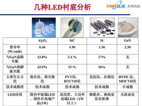 但是在這里面我們今天講的主要是藍寶石、碳化硅,剛才在講的時候我思考幾個問題,這幾個材料在發(fā)光效率上藍寶石可以做到150lm/W,碳化硅可以做到200lm/W,在發(fā)光效率上確實體現(xiàn)差異。在物理基礎(chǔ)參數(shù)上體現(xiàn)了差異,比如說跟氮化鎵外延,從晶格匹配上,碳化硅上長氮化鎵確實好一些,藍寶石失配大一些,直接影響外延的質(zhì)量。另外導電性、熱導率也是有差異的。