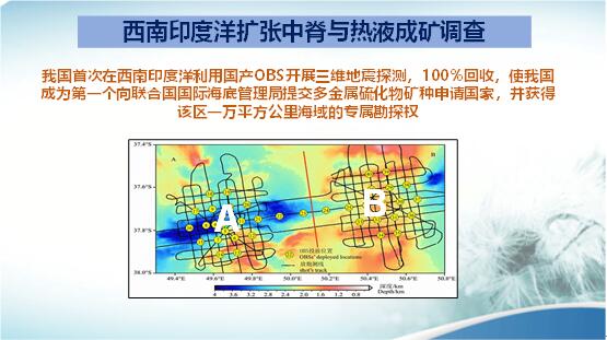 在全球的海洋中,大部分海洋為公海,有些國(guó)家已圈出自己具有礦產(chǎn)調(diào)查和開(kāi)采權(quán)的某片海域。我們國(guó)家在西南印度洋布設(shè)了“中國(guó)結(jié)”的地震臺(tái)網(wǎng),開(kāi)展三維地震觀測(cè)。并第一個(gè)向聯(lián)合國(guó)國(guó)際海洋海底管理局申請(qǐng),獲得了這一地區(qū)一萬(wàn)平方公里的多金屬硫化礦物的專屬開(kāi)采權(quán)。