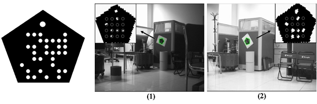 圖6 面向機(jī)器人視覺(jué)系統(tǒng)的MR-二維碼,左圖是MR-二維碼,右圖(1)和(2)是MR-二維碼在不同光照下的識(shí)別效果