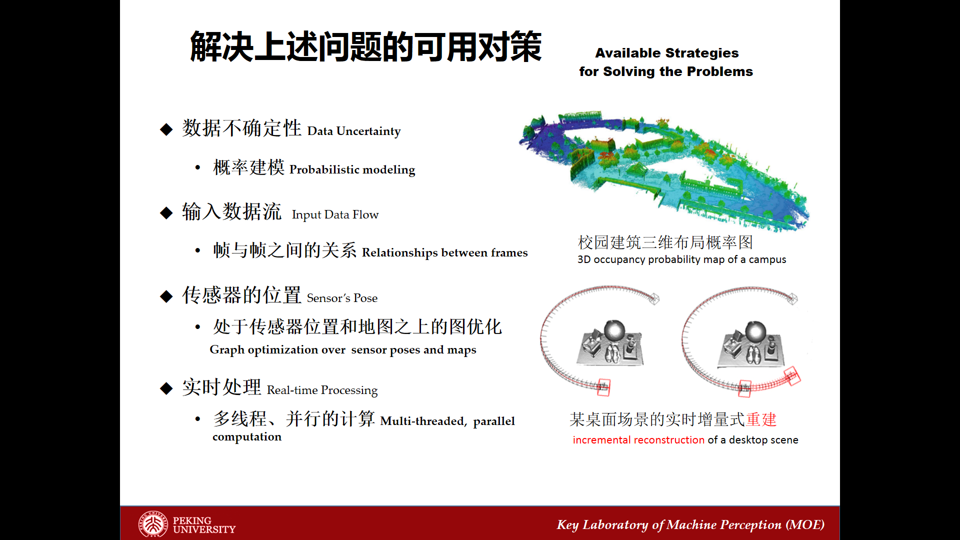 這里有一些對(duì)策,我給各位介紹一下相關(guān)的研究。我前面講的第一個(gè)問(wèn)題,就是數(shù)據(jù)的不確定性的處理。我們做定位也好,做建模也好,要有一個(gè)通用的空間的描述,這個(gè)描述有了以后能夠把這些做好??臻g的描述就是方位構(gòu)圖,有各種各樣的描述方式。以前講的描述方式是“零、一”關(guān)系,里面有物體就是一,沒(méi)物體就是零。但是現(xiàn)在描述空間可能不是“零、一”的關(guān)系,對(duì)空間只能有一個(gè)概率的描述。應(yīng)該把這個(gè)場(chǎng)景的面的存在的概率是多少先計(jì)算出來(lái),用一些推理。如何用更復(fù)雜的非參數(shù)的推理來(lái)做,有一系列問(wèn)題在里面。能不能把三維空間看成格子狀的結(jié)構(gòu),這里面的每一個(gè)點(diǎn)它到底在不在這個(gè)面上,它有一定的概率,把這個(gè)概率數(shù)據(jù)收集進(jìn)來(lái)以后,數(shù)據(jù)對(duì)概率產(chǎn)生了改變,我可以更有把握地說(shuō)有這個(gè)表面。通過(guò)我進(jìn)來(lái)的每一個(gè)采樣點(diǎn)對(duì)這個(gè)空間的概率分布做修正。這是這篇文章所做的工作。我們實(shí)驗(yàn)室有些學(xué)生對(duì)這方面做了更好的改進(jìn),現(xiàn)在投到了ECCV這個(gè)國(guó)際會(huì)議上,把空間的表示用概率的描述表示了。