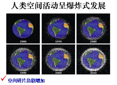 當(dāng)前,有各種飛行器在空間運行,空間充滿了飛行器、衛(wèi)星、退役產(chǎn)生的碎片。從下面的圖中可以看到,在1960年和2010年間,地球表面飛行物的比較,在2010年的地球空間充滿了太多的飛行物等。