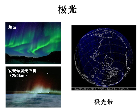 太陽風(fēng)的暴發(fā),發(fā)生地球空間暴,會引起高能粒子暴,磁場擾動,形成磁暴,產(chǎn)生電離層暴和熱暴。太陽風(fēng)吹向地球,使磁場偏轉(zhuǎn),會在地球的南北極形成美麗的極光。圖中顯示的極光,有從地面看到的,有從距地球表面250公里的航天飛機(jī)上看到的。