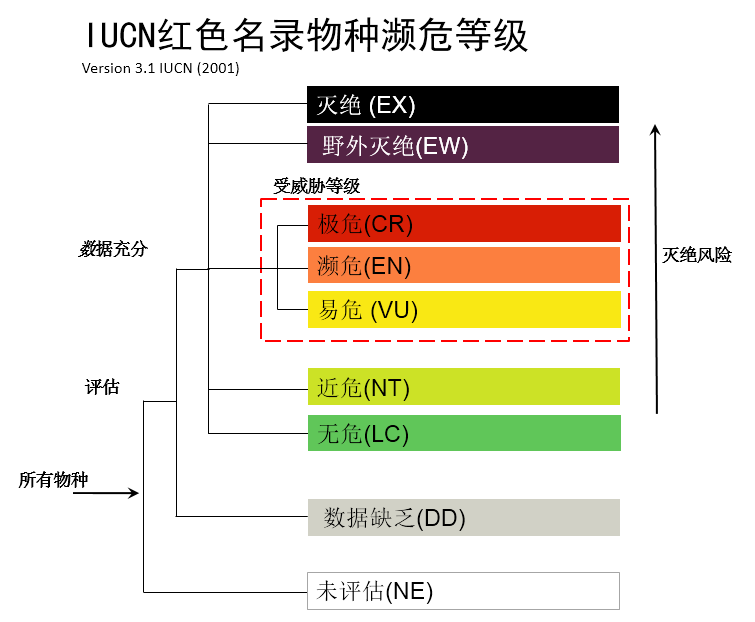 IUCN自20世紀(jì)60年代成立之日起,就設(shè)立了物種生存委員會(huì)(SSC),開始編制和印刷《IUCN瀕危物種紅皮書》,后來(lái)隨著評(píng)估物種的增加,印刷版逐步發(fā)展為網(wǎng)絡(luò)版的《IUCN瀕危物種紅色名錄》,定期編制發(fā)布。IUCN/SSC研究制定了《IUCN物種紅色名錄瀕危等級(jí)和標(biāo)準(zhǔn)》,根據(jù)物種的種群數(shù)量和分布情況等,評(píng)估其生存狀況,確定其瀕危等級(jí)。IUCN瀕危物種等級(jí)標(biāo)準(zhǔn)分為“有評(píng)估數(shù)據(jù)”和“數(shù)據(jù)缺乏”兩類,“有數(shù)據(jù)評(píng)估”中又分為“滅絕”、“野外滅絕”、“區(qū)域滅絕”、“極?!薄ⅰ盀l?!?、“易?!?、“近?!焙汀盁o(wú)?!钡?個(gè)級(jí)別,從“無(wú)?!钡健皹O危”,滅絕風(fēng)險(xiǎn)逐步上升,瀕危等級(jí)逐步增加。瀕危等級(jí)標(biāo)準(zhǔn)有5個(gè)指標(biāo),分別是種群下降、有限地理分布區(qū)、下降小種群、非常小或非常有限的種群、以及模型模擬等量化分析,根據(jù)這些指標(biāo)的數(shù)量閾值,來(lái)評(píng)估物種的瀕危等級(jí)。