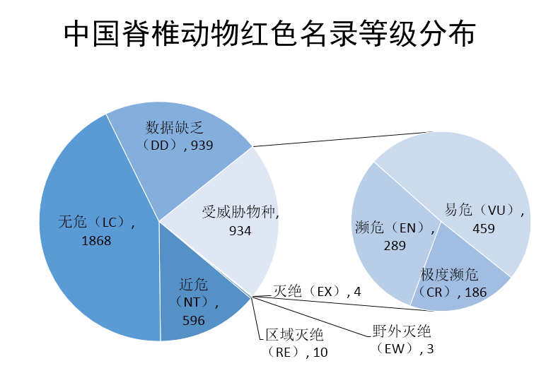 2015年完成的《中國(guó)生物多樣性紅色名錄-脊椎動(dòng)物卷》,共評(píng)估了中國(guó)4357種脊椎動(dòng)物,包括673種哺乳類,1372種鳥類,461種爬行類,408種兩棲類,1443種淡水魚類。其中939種數(shù)據(jù)缺乏,1868種無(wú)危,596種近危,受威脅的物種共934種。在934種受威脅物種當(dāng)中,易危459種,瀕危289種,極度瀕危186種。受威脅的原因分析中,過(guò)度利用、生境喪失和人類干擾是最主要的威脅因子。