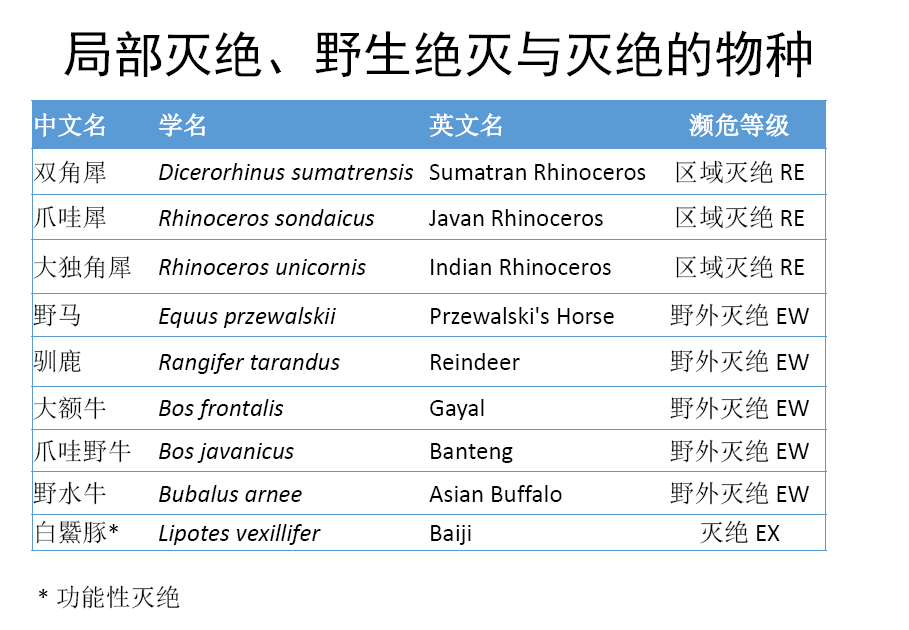 此外,我們對(duì)中國(guó)哺乳動(dòng)物多樣性進(jìn)行編目,分別于2015年和2017年完成了第一版和第二版,第一版中,我們收錄了673種哺乳動(dòng)物,第二版中我們刪除了一些不存在的物種如倭巖羊,并增添了一些物種,主要是分布在藏南的一些物種,共收錄了693種哺乳動(dòng)物,使得我國(guó)的哺乳動(dòng)物總數(shù)位列全球首位。2015年發(fā)布《中國(guó)生物多樣性紅色名錄-脊椎動(dòng)物卷》后,2018年又對(duì)該紅色名錄等級(jí)進(jìn)行了更新,哺乳動(dòng)物的情況來(lái)看,最新的評(píng)估結(jié)果中,受威脅的物種占26%、近危21%,無(wú)危40%,數(shù)據(jù)缺乏12%,其中有多個(gè)物種已經(jīng)區(qū)域滅絕、野外滅絕或功能性滅絕。部分中國(guó)特有的哺乳動(dòng)物,中國(guó)生物多樣性紅色名錄和IUCN紅色名錄的評(píng)估結(jié)果,由于評(píng)估信息的不同,結(jié)果也有所不同,如白鱀豚、長(zhǎng)江江豚等;還有一些哺乳動(dòng)物由于并非中國(guó)特有,所以中國(guó)生物多樣性紅色名錄和IUCN紅色名錄評(píng)估等級(jí)有所不同,如野馬、賽加羚羊、麋鹿、蒙原羚、河貍等。