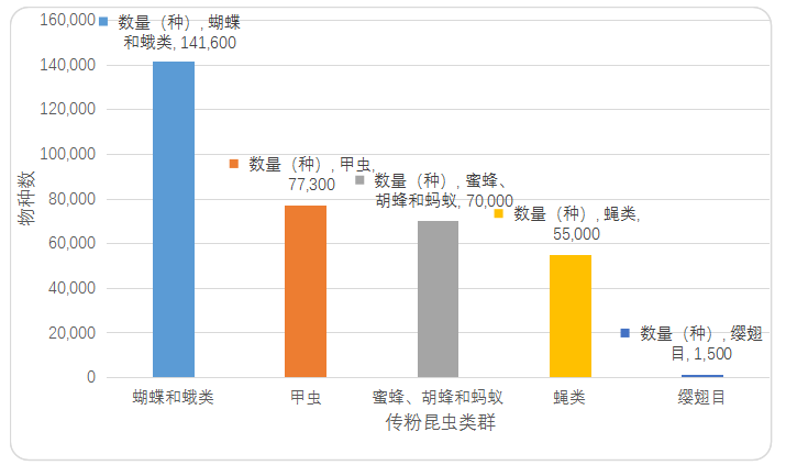 傳粉昆蟲占所有動物傳粉的80%~85%,為植物-傳粉者生態(tài)系統(tǒng)提供重要服務(wù),其重要性得到科研工作者和大眾的廣泛認同。據(jù)估計,全球生物物種多樣性約870萬,昆蟲占一半以上,是自然界最主要的傳粉者。目前,已報道的傳粉昆蟲約35萬種,涉及鱗翅目(約14萬種)、鞘翅目(約7.7萬種)、膜翅目(約7萬種)、雙翅目(約5.5萬種)以及其他類群(約0.8萬種)。蜜蜂是最主要的傳粉昆蟲,約有17,000種,全球107種重要作物種類中的90%是由蜜蜂完成傳粉。