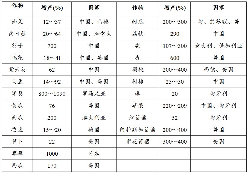 表1 國內(nèi)外用蜜蜂為農(nóng)作物和果樹授粉的增產(chǎn)效果
