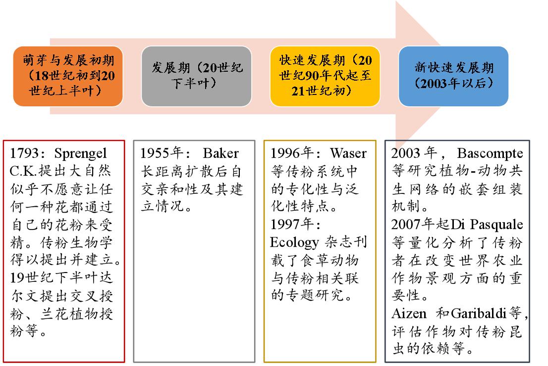 由于傳粉昆蟲的重要性以及目前所面臨的危機已經(jīng)引起科學家和民眾的廣泛關(guān)注。諸多地區(qū)級、國家級乃至全球級別的傳粉研究已經(jīng)取得了階段性的成果。就全球范圍來說,傳粉昆蟲的研究主要包括四個時期,分別為:1)萌芽與發(fā)展初期(18世紀初到20世紀上半葉);2)發(fā)展期(20世紀下半葉);3)快速發(fā)展期(20世紀90年代起至21世紀初);4)新快速發(fā)展期(2003年以后)。