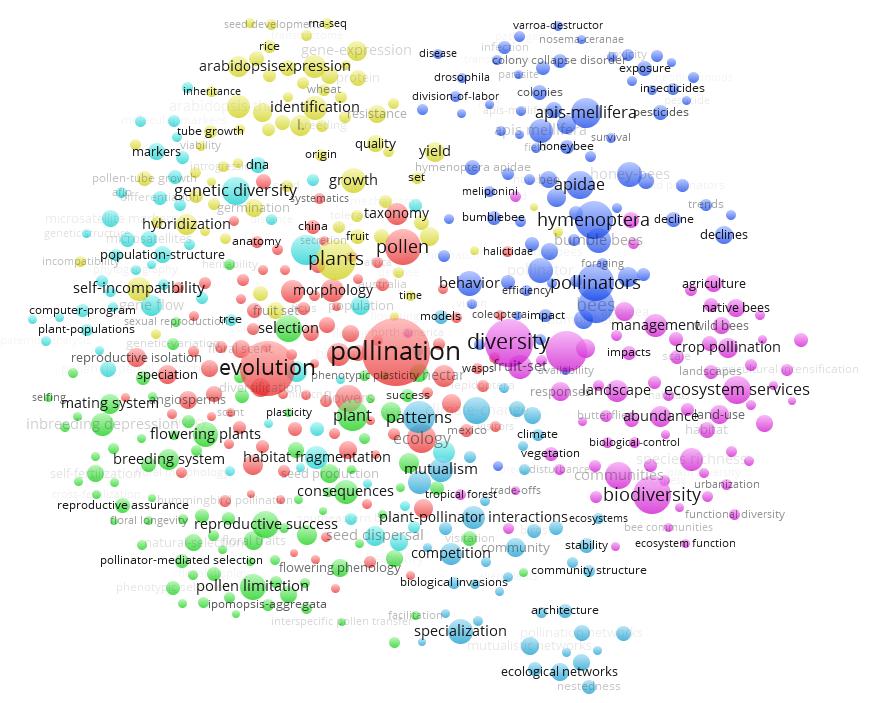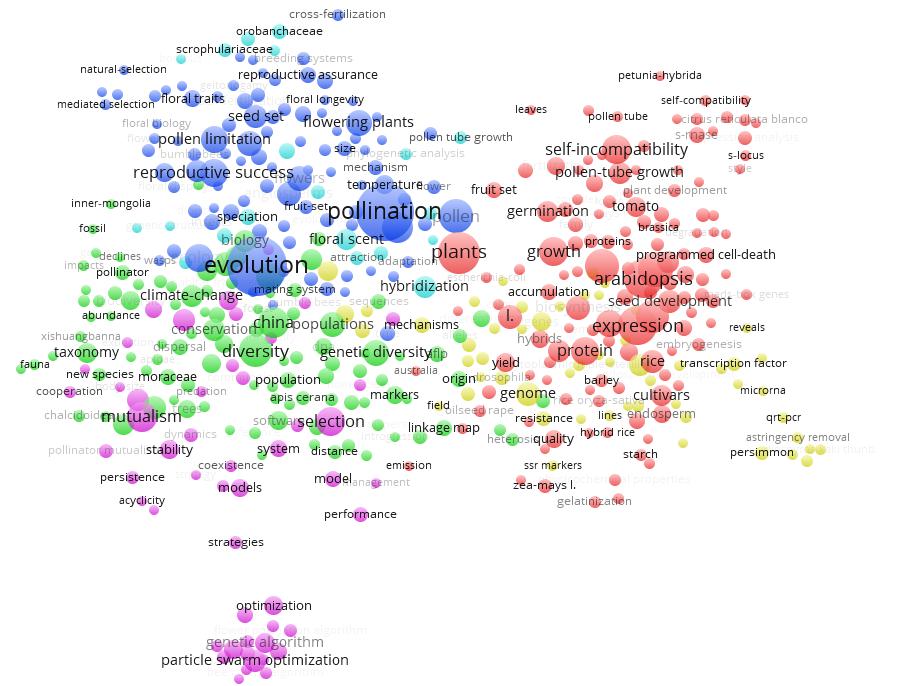 與此同時我們還通過ESI對pollination和pollinator等關(guān)鍵詞進行檢索,可以大致得出傳粉昆蟲研究領(lǐng)域的現(xiàn)有研究前沿如下:1)常用新煙堿類殺蟲劑對蜜蜂的殺傷作用;2)野生授粉昆蟲對農(nóng)業(yè)增收和作物健康的積極影響;3)傳粉昆蟲種群測量與評估;4)花朵與傳粉昆蟲的生態(tài)聯(lián)系。通過利用Vos Viewer軟件繪制傳粉生物學關(guān)鍵詞共現(xiàn)(co-occurrence)聚類圖,獲得傳粉生物學領(lǐng)域的研究熱點包括:1)傳粉昆蟲的形態(tài)學、系統(tǒng)進化、分類學方面的研究;2)傳粉昆蟲介導的植物繁殖、選育、選種等的研究,以及花粉限制對傳粉昆蟲的影響;3)殺蟲劑導致傳粉昆蟲,尤其是蜜蜂、熊蜂的種群下降的影響;4)傳粉昆蟲介導的植物基因表達、生長、增產(chǎn)等;5)景觀變化、城市化等環(huán)境因素導致生物多樣性降低、傳粉服務(wù)功能下降、傳粉昆蟲群體數(shù)量下降等影響評估,并提出相關(guān)的控制與管理措施;6)植物-傳粉昆蟲互作與共生、植物與傳粉昆蟲形成的生態(tài)網(wǎng)絡(luò)結(jié)構(gòu)等方面的研究;7)傳粉使植物基因流擴散,使植物基因變異和多樣性。
