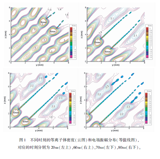 下面看一下相交微波束大氣擊穿的模擬結(jié)果,我們首先算了同頻率微波相交的情況,此時相干疊加之后,由于干涉作用,會形成電場強(qiáng)度強(qiáng)弱分布。我們首先模擬一下種子電子在弱場區(qū)的情況。因?yàn)樵诖髿庵蟹N子電子是偶然出現(xiàn)的,有可能出現(xiàn)弱場區(qū),如果出現(xiàn)在弱場區(qū),它需要擴(kuò)散,擴(kuò)散到強(qiáng)場區(qū)之后電子碰撞分子發(fā)生雪崩電離,形成的等離子體沿著強(qiáng)場區(qū)做趨源運(yùn)動,運(yùn)動方向沿著)=:的這條線。形成的等離子體的區(qū)域是一個等離子體絲帶,當(dāng)然如果把氣壓降低,會發(fā)現(xiàn)絲帶就會過渡為一個等離子體帶。圖1給了幾個典型時刻的等離子體密度分布和場強(qiáng)的分布,在20ns的時候,由于靠近等離子體區(qū)域最強(qiáng)的場是沿著)=:這條線的,當(dāng)?shù)入x子體絲帶長度增加到一定程度的時候,在其左上和右下區(qū)域,相當(dāng)于把兩個微波場隔開,這兩個區(qū)域相當(dāng)于只有一個單微波的作用,在兩邊有新的等離子體絲帶。如果初始電子出現(xiàn)在強(qiáng)場區(qū),電子碰撞分子就會雪崩電離,形成等離子體。等離子體區(qū)域也是沿著J=:這條線做趨源運(yùn)動。下面簡單比較了同頻和非同頻微波相交的大氣擊穿,同頻相當(dāng)于相干疊加,非同頻相當(dāng)于非相干疊加,模擬時間都是80ns,初始的種子電子數(shù)都一樣,可以發(fā)現(xiàn)在相干的情況下,即使把種子電子源放到場強(qiáng)最小的地方,產(chǎn)生等離子體的區(qū)域也大于非相干的情況,而且產(chǎn)生的最大電子數(shù)也是大于非相干的情況??偨Y(jié)主要有三點(diǎn),一個是區(qū)域隨壓強(qiáng)的變化,還有等離子體做趨源運(yùn)動,還有相干比非相干的等離子體區(qū)域比較大。