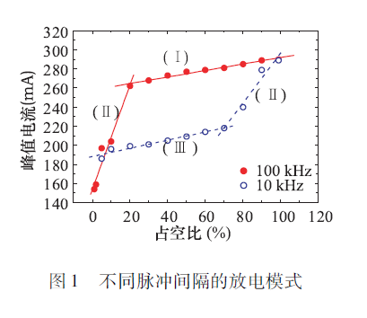 如果兩個脈沖間隔比較近,那么跟連續(xù)就沒什么差異,因?yàn)槊}沖撤銷以后,即射頻消失以后,電極間還存在的空間電荷,也就是有電子和離子分離存在,這些電子在第二脈沖上來后就會參與放電,這時與連續(xù)放電差異性就不大了。如果脈沖間隔范圍足夠?qū)?,這就成為兩個不同的放電,兩個放電之間是不相關(guān)的。如圖1( I)是脈沖之間間隔非常小的時候,稱為連續(xù)模式;下面的Ⅲ是脈沖之間間隔非常大的時候,稱為分離模式,我們可以看到整個放電的峰值電流要小不少。在它們之間,(II)稱為傳輸模式,在兩個脈沖之間,電子沒有完全消亡的情況下放電電流與占空比的關(guān)系。共有上述三個過程,可見脈沖的間隔長短對放電的影響不是由占空比決定,主要是考慮電極之間間距和里面所參與的空間電荷分布變化。