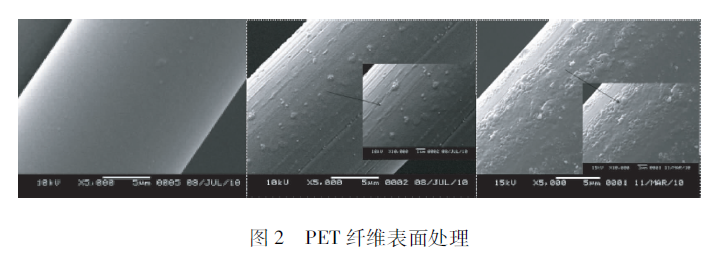 用長50cm、間距5cm的電極板做了一個射頻的放電模式。我們用上面介紹的JET做了滅菌實(shí)驗(yàn),細(xì)菌的存活數(shù)量得到了有效的下降。在這里主要看一下對化纖的處理效果,圖2的左圖是沒有處理過的,中圖是200 W處理的,右圖是800 W處理的。這兩個之間有什么區(qū)別呢?中圖顯示纖維表面有溝槽出來,這任何化纖在等離子體處理情況下刻蝕的一個特征,在低真空情況下的射頻放電都會有溝槽刻蝕出來。但是在大氣壓輝光放電的情況下,表面有許多圓形體產(chǎn)生。我認(rèn)為不單純有刻蝕,而且有表面熔融的狀態(tài)出來。所以說,在大氣壓射頻放電對表面的作用是相當(dāng)強(qiáng)的。雖然每個脈沖時間比較短,但是它的作用非常強(qiáng)。